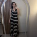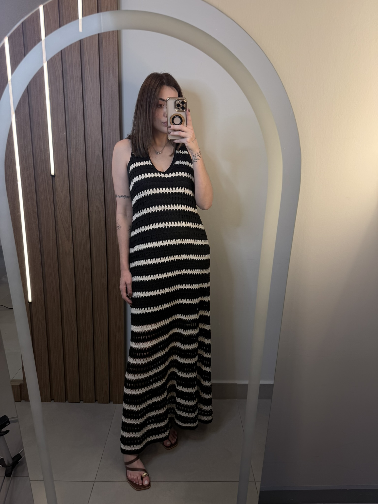 O vestido longo regata de tricô listrado é a combinação perfeita entre conforto e estilo. Feito em tricô macio e com excelente elasticidade, ele se ajusta ao corpo com suavidade, valorizando as curvas sem apertar. As listras alongam a silhueta, trazendo um visual moderno e elegante para qualquer ocasião.